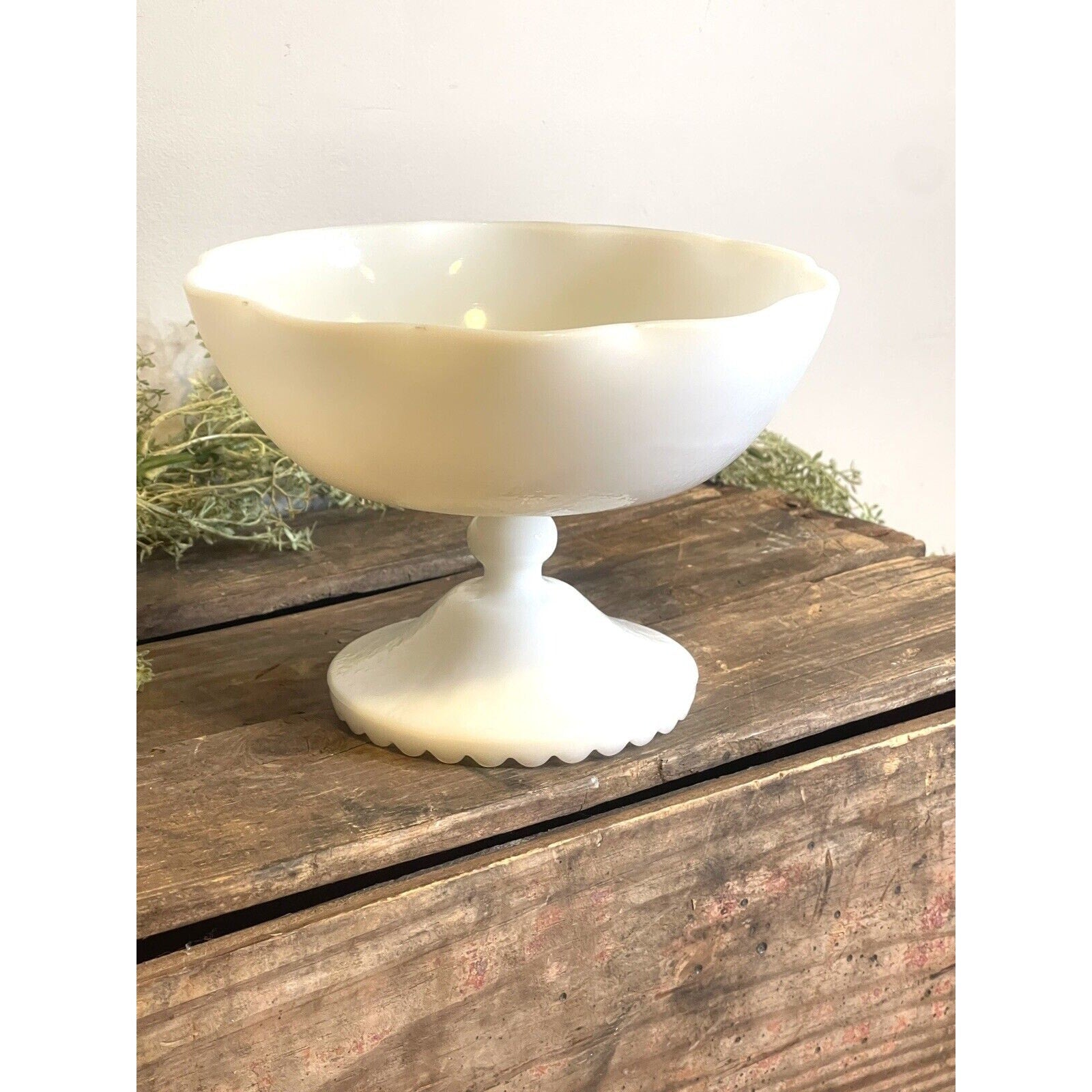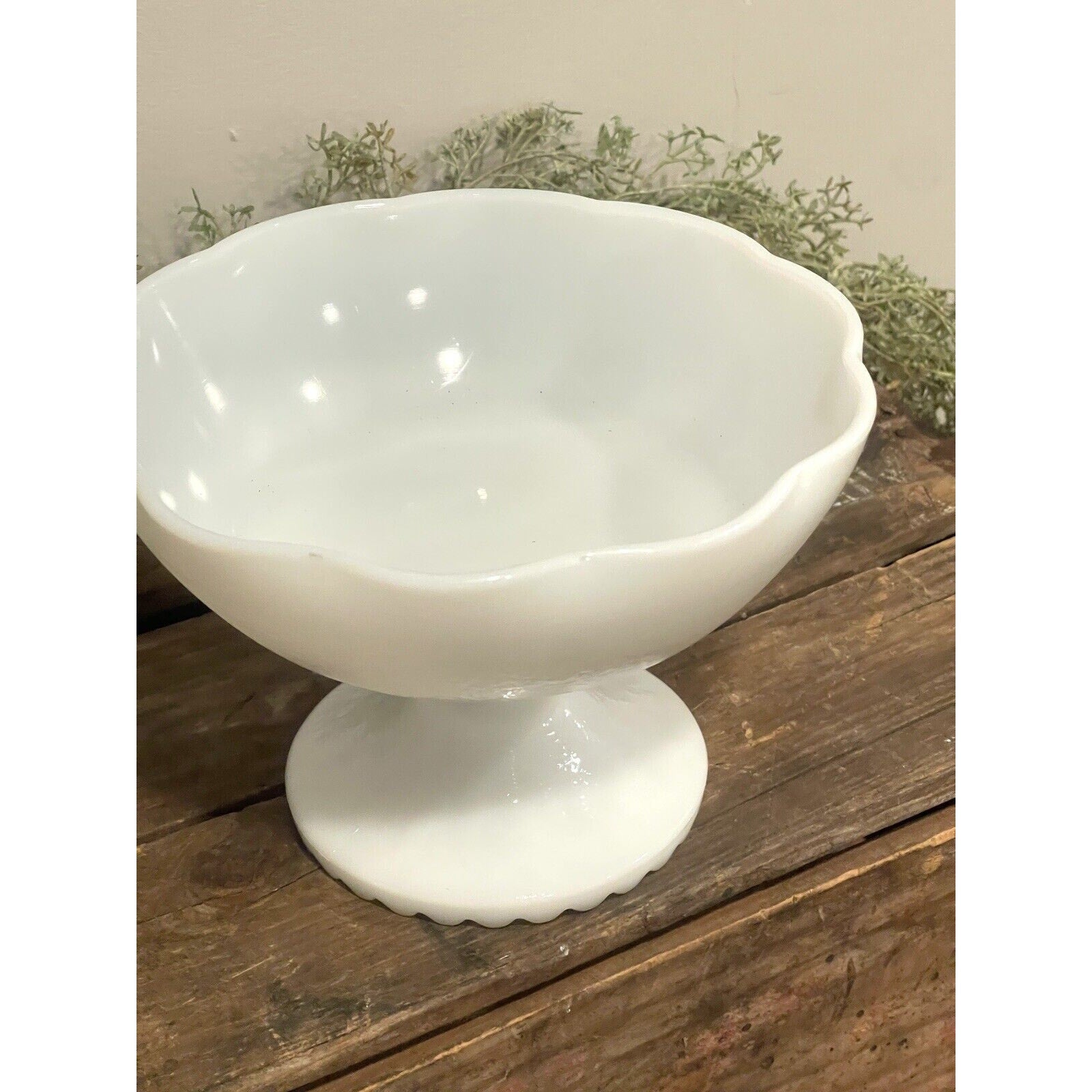 Vintage Hazel Atlas Milk Glass Pedestal Bowl Ruffeled Edge Orange Peel Scalloped